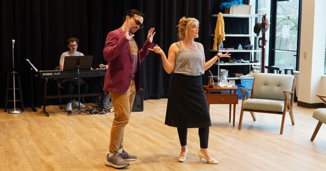 Rehearsal photo featuring Sam Simahk (The Doctor/Others), Mollie Vogt-Welch (Rosemary Clooney)