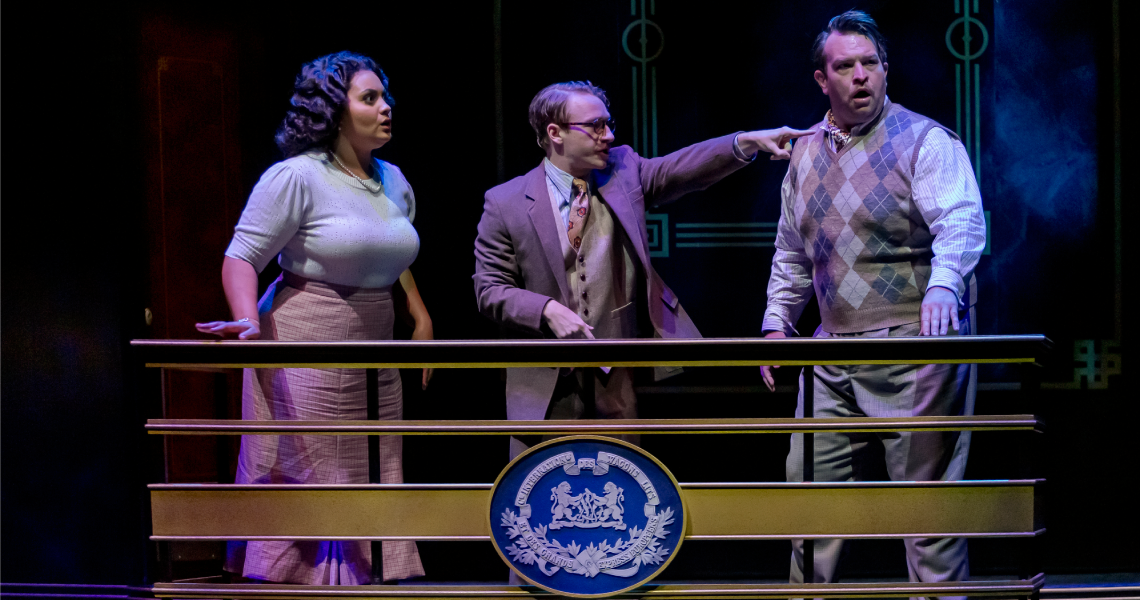 China Brickey (Mary Debenham), Harry Davis (Hector MacQueen) and Nick Vannoy (Colonel Arbuthnot) in Agatha Christie’s Murder on the Orient Express. Photo by Mikki Schaffner.