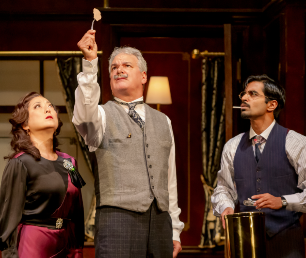 Katie Bradley (Countess Andrenyi), Andrew May (Hercule Poirot) and Taha Mandviwala (Monsieur Bouc) in Agatha Christie’s Murder on the Orient Express . Photo by Mikki Schaffner.