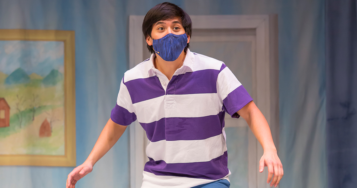 A.J. Baldwin (Red/Yellow Dragons), Joshua Carandang (Boy), Phineas Clark (Man in Suit), Sydney E. Crutcher (Leroy, a dog) and Kenneth Hamilton (Blue/White Dragons). Photo by Mikki Schaffner.